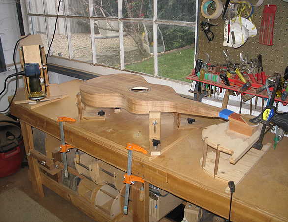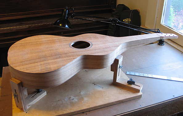 I just spent about an hour adapting my holding cradle for this instrument. I had to drill a couple more holes in the platform for better positioning of the holding clamps, so it would hold the instrument more solidly. Then I set the guitar in the cradle so that all the sides were perpendicular to the platform: