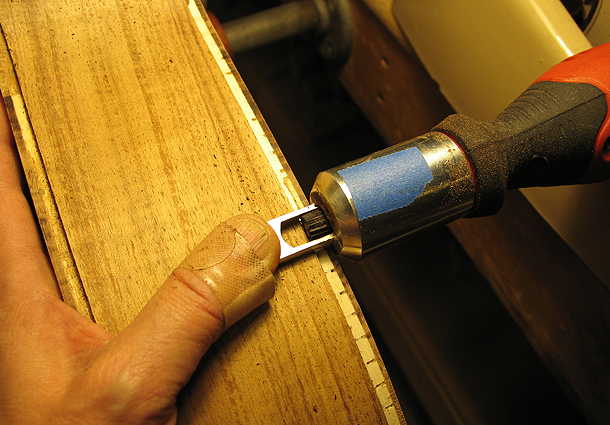 Here's how I use it. (I had to lay the Dremel upon a support in order to take the photo, so I'm not actually holding it here!) I use a Dremel #115 cutter bit; it routs out the channel much more smoothly than the 2-fluted carbide cutter bit that Stew-Mac sells for use with this attachment. That blue masking tape is there to remind me to have that side of the attachment facing up (because the .090" depth is on the opposite side --- if I mistakenly turn it the other way, I would end up routing only a .060" channel).