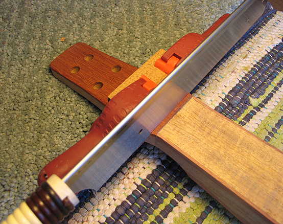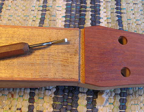 The first thing I did today was to cut the nut slot. As the nut will be sitting in the angled-back peghead, I needed to cut a block which had the required 8-degree back angle, so I would have a guide for a saw cut that would be perpendicular to the fingerboard surface. I clamped the guide to the peghead and used my Dozuki saw to cut through the bloodwood veneer. My nut slot is 3/16" wide.
