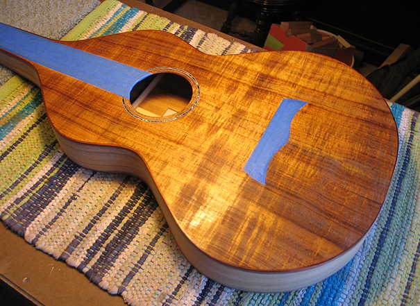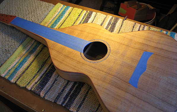 Then I masked the areas where the fingerboard and bridge will be glued: