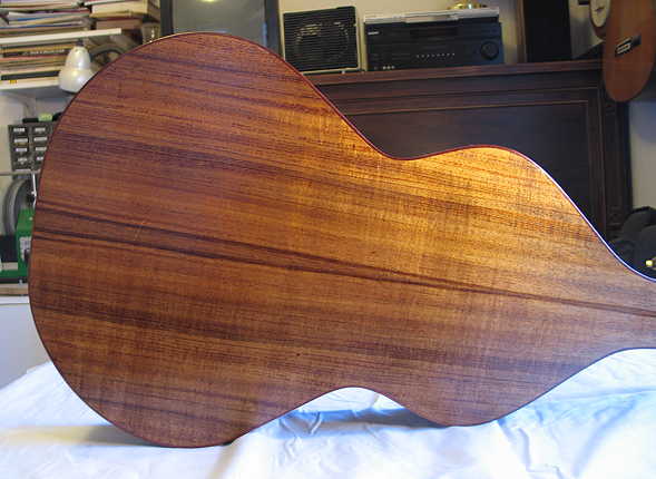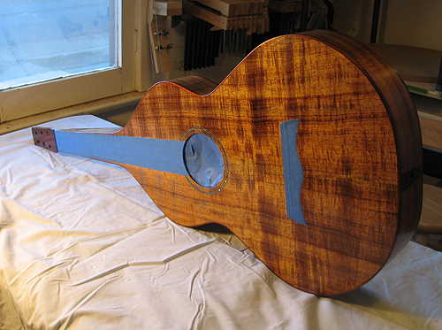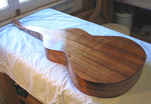 I spent a few hours this morning doing the final sanding of the entire guitar, using first 120-grit, then 220-grit sandpaper. I did a couple of grain-raisings and sanding again with the 220, for a nice, smooth finish.