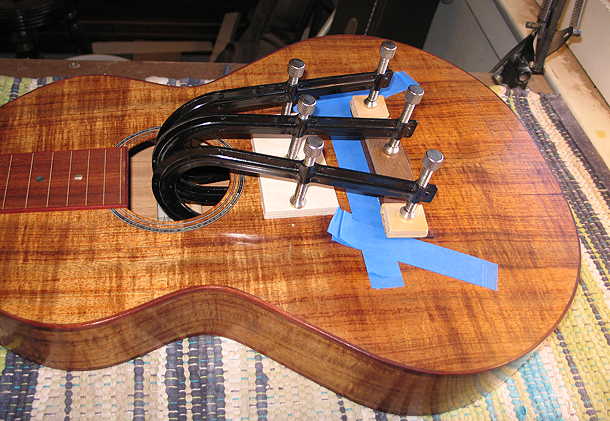 I just glued on the bridge. First I built up a few masking tape layers on three sides of the bridge, to help properly position it and to help stabilize it once the glue was applied and the clamps tightened. After I applied the glue, I held the bridge in place for a little while, until it was somewhat "set" in place. Then I applied the three clamps, with a caul underneath and cauls above, cleaning up the glue squeeze-out with a moistened paper towel and bamboo skewer (the pointy tip helped to wipe away the glue along the bottom edge of the bridge). In about 45 minutes or so, I'll remove the clamps and let it sit till tomorrow, before I apply any stress to the bridge (install the strings). Meanwhile, I will probably install the tuners.