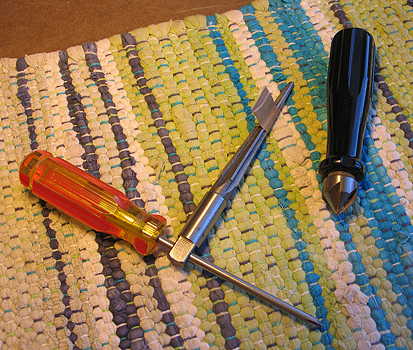 Finally, I sawed out the slots for the strings (a set of Martin phosphor bronze mediums I had on hand, ranging from .013" to .056"). I first use one of these pumpkin-carving thingies (I've had these ever since I started building!) to saw the slot, and then I use a needle file to enlarge and smooth it out: