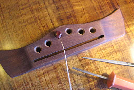 Got a little bit of a late start today (had an eye exam appointment for new glasses). It's about 1:00 p.m. right now. But, so far, I have managed to take care of fitting the bridge pins. I first drilled the 3/16" holes through the bridge plate and used these two tools (a regular hardware store reamer and a manual countersink tool) to ream and countersink the holes to fit the bloodwood bridge pins.