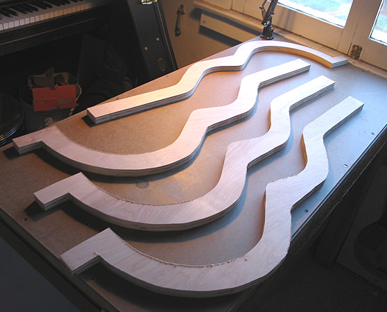 This is what I did yesterday --- I bandsawed the remaining three mold pieces close to the lines. The "master" template is the one at the very top of the picture.