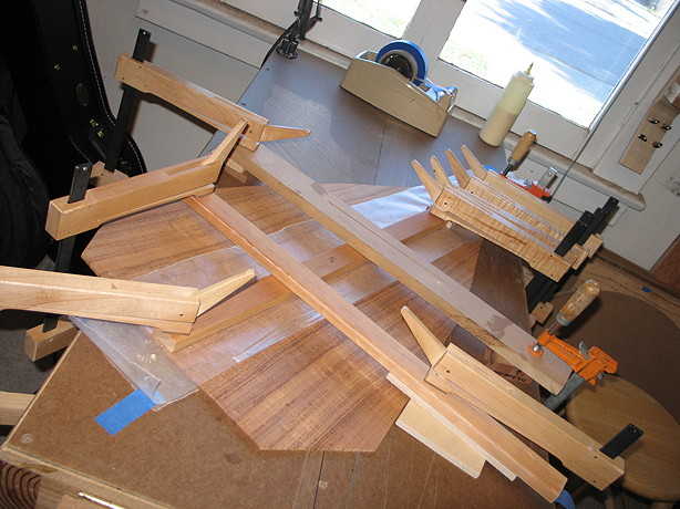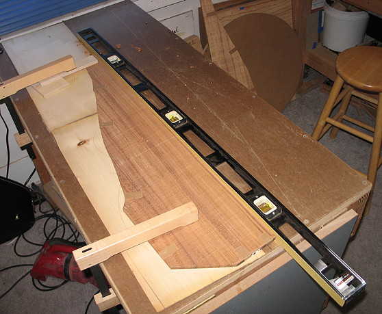 The photo in the lower right shows how I've clamped the joint down, with waxed paper both below and above the glued joint, and wood strips holding the joint flat.