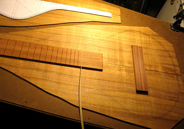Another reason I haven't worked on it for the past few days was that I was waiting for a few of the supplies to come. I had ordered a slotted fingerboard (25" scale) and a bridge blank, both of Granadillo wood, which I'd never heard of or seen before. But it looked as if its color would go well with this Tasmanian blackwood. To the right is a photo of the fingerboard and bridge blank. (I also have some maple veneer strips that I will use to inlay the fret slots, which you can see in the photo.) (It will be so nice not to have to install frets this time!) |