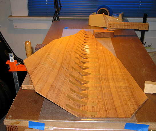 The first thing I did was to joint the two sets of wood. I found the easiest way to do it, this time, since the pieces were so long, was to place the bookmatched halves on top of some spruce plates I had handy, and use my four-foot level (with sandpaper stuck to one edge) to do the jointing. It took a while, but I was finally able to joint the edges so that no light shone through when I held the two halves together. I did this for both the top and back plates (both Australian blackwood).