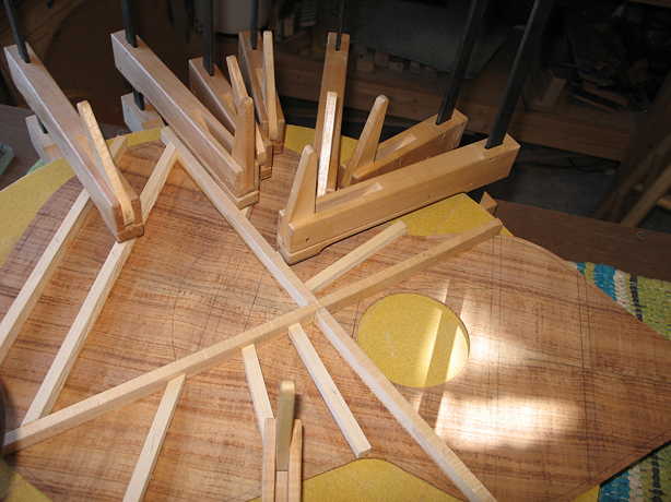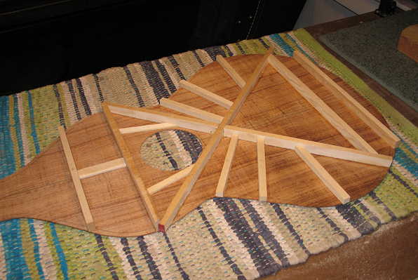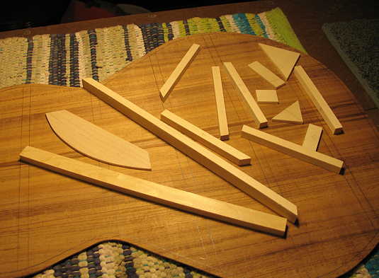Here are some more of the braces for the top (I forgot to put the two upper bout transverse braces in the photo!):