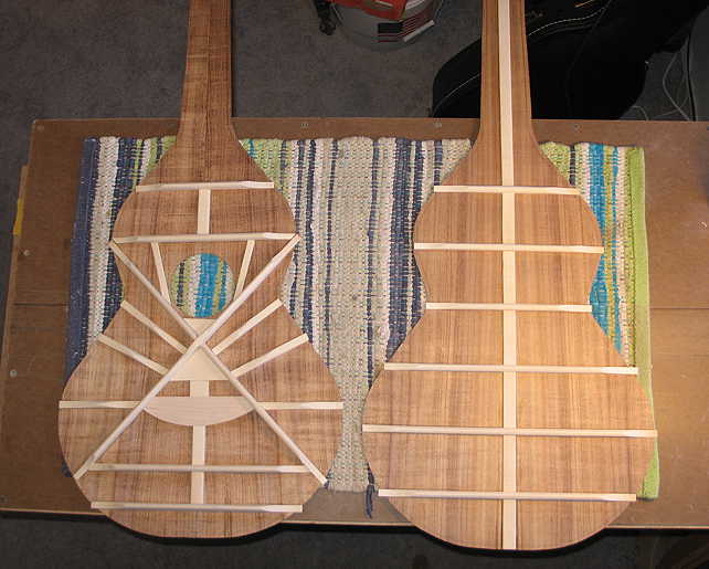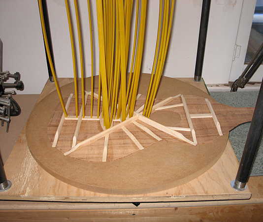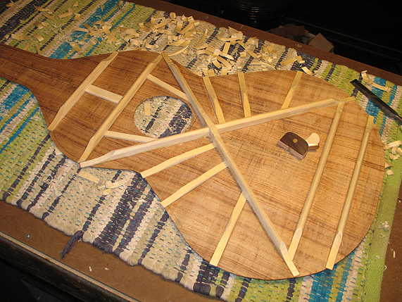 Tomorrow, I will sand the braces smooth and then glue on the remaining braces (the two triangle braces, remaining centerstrip braces, and the bridge plate). Then it will be time to carve the back braces. |
