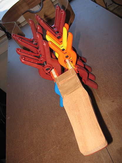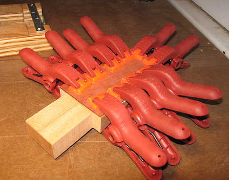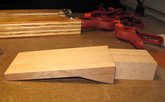 The next thing I did today was to make the spruce neck doublers (sometimes called neck strengtheners), which reinforce the straight run of the neck. I made mine 7/32" thick, which is the same dimension as the basswood kerfing I will be installing. Here it is being glued up: