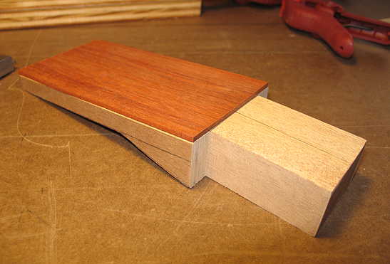 Finally, I glued on the bloodwood veneer. Tomorrow I will finish up the peghead and glue it to the sides.