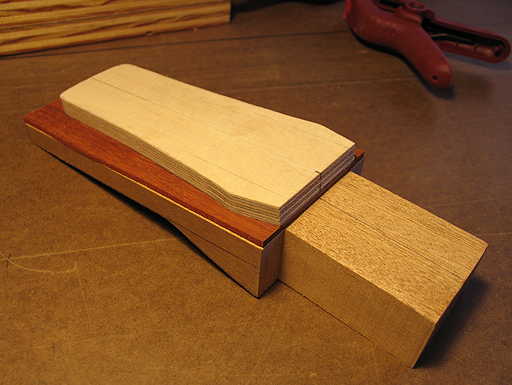 Then, I laid out a piece of bloodwood I will use as the peghead veneer.